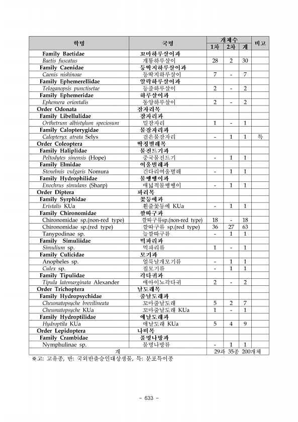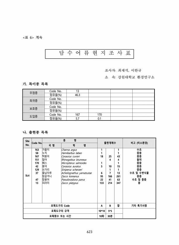 623 표 6 계속 담 수 어 류 현 지 조 사 표 조사자최재석, 이한규 소 속강원대학교 환경연구소 가. 특이종 목록 우점종 Code No. 13 점유율 % 46.3 희귀종 Code No. 점유율 % 보호종 Code No. 점유율 % 도입종 Code No. 167 170 점유율 % 5.7 0.1 나. 출현종 목록 Site No. Code No. 종 명 출현개체수 비고 미소환경 국 명 학 명 St.4 163 가물치 Channa argus 1 1 수초 58 누치 Hemibarbus labeo 1 1 중층 167 떡붕어 Carassius cuvieri 18 25 43 중층 151 밀어 Rhinogobius brunneus 4 4 돌위 170 배스 Micropterus salmoides 1 1 중층 42 붕어 Ca...