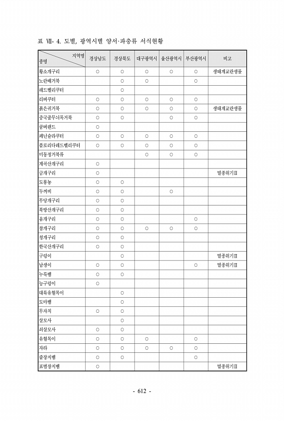 표 Ⅶ- 4. 도별, 광역시별 양서·파충류 서식현황 지역명 종명 경상남도 경상북도 대구광역시 울산광역시 부산광역시 비고 황소개구리 ○ ○ ○ ○ ○ 생태계교란생물 노란배거북 ○ ○ ○ 레드벨리쿠터 ○ 리버쿠터 ○ ○ ○ ○ ○ 붉은귀거북 ○ ○ ○ ○ ○ 생태계교란생물 중국줄무늬목거북 ○ ○ ○ ○ 쿰버랜드 ○ 페닌슐라쿠터 ○ ○ ○ ○ ○ 플로리다레드벨리쿠터 ○ ○ ○ ○ ○ 미동정거북류 ○ ○ ○ 계곡산개구리 ○ 금개구리 ○ 멸종위기Ⅱ 도롱뇽 ○ ○ 두꺼비 ○ ○ ○ 무당개구리 ○ ○ 북방산개구리 ○ ○ 옴개구리 ○ ○ ○ 참개구리 ○ ○ ○ ○ ○ 청개구리 ○ ○ 한국산개구리 ○ ○ 구렁이 ○ 멸종위기Ⅱ 남생이 ○ ○ ○ 멸종위기Ⅱ 누룩뱀 ○ ○ 능구렁이 ○ 대륙유혈목이 ○ 도마뱀 ○ 무자치 ○ ○ 살...