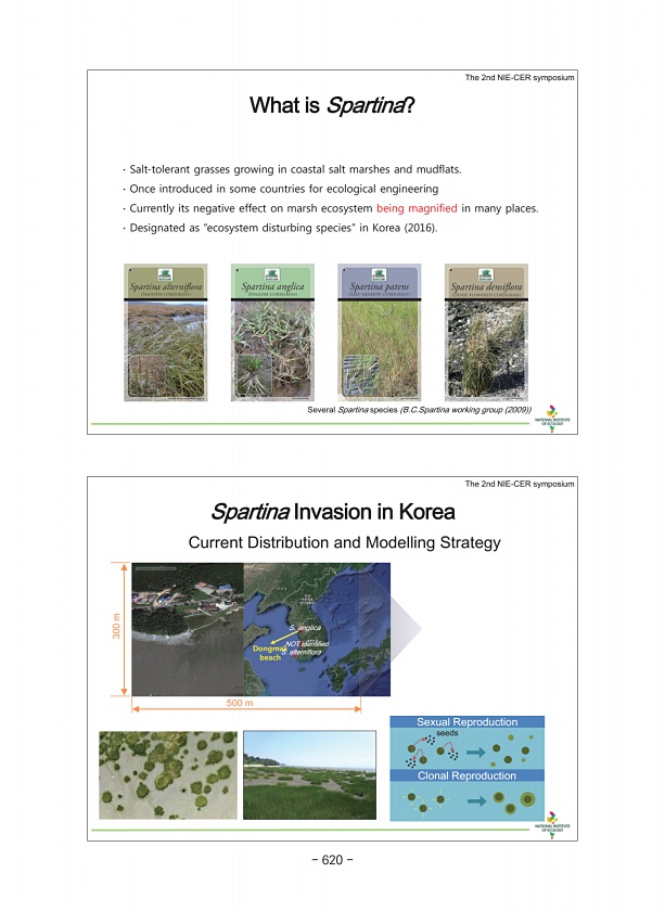 500 m 300 m Dongmak beach Spartina Invasion in Korea Current Distribution and Modelling Strategy The 2nd NIE-CER symposium S. alterniflora S. anglica NOT identified Sexual Reproduction Clonal Reproduction seeds What is Spartina? The 2nd NIE-CER symposium Several Spartina species B.C.Spartina working group 2009 ? Salt-tolerant grasses growing in coastal salt marshes and mudflats. ? Once introduced ...