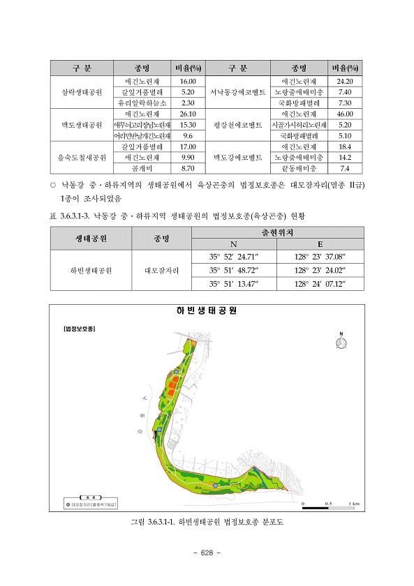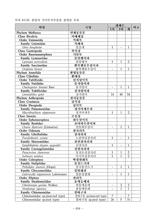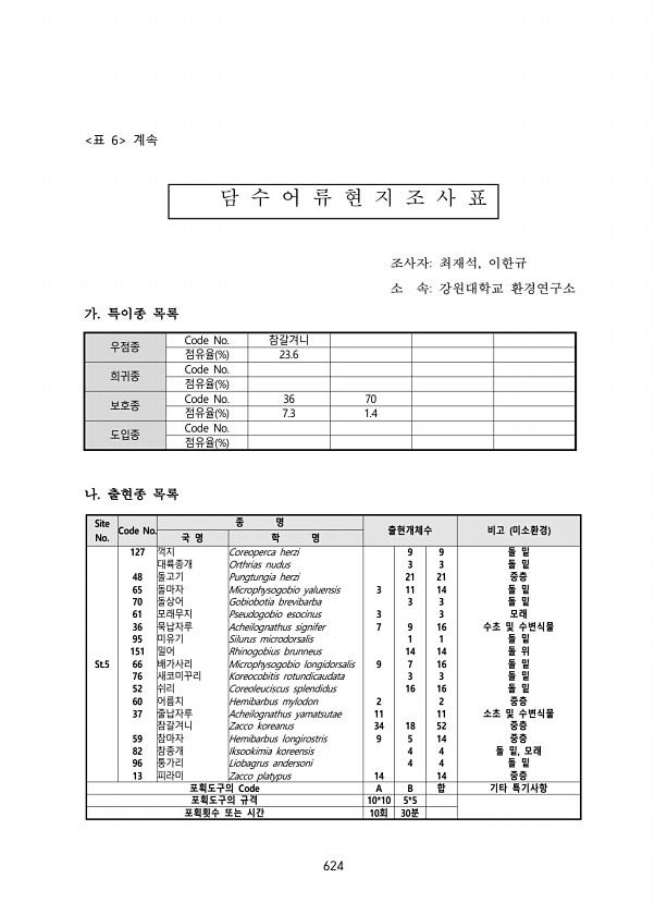 624 표 6 계속 담 수 어 류 현 지 조 사 표 조사자최재석, 이한규 소 속강원대학교 환경연구소 가. 특이종 목록 우점종 Code No. 참갈겨니 점유율 % 23.6 희귀종 Code No. 점유율 % 보호종 Code No. 36 70 점유율 % 7.3 1.4 도입종 Code No. 점유율 % 나. 출현종 목록 Site No. Code No. 종 명 출현개체수 비고 미소환경 국 명 학 명 St.5 127 꺽지 Coreoperca herzi 9 9 돌 밑 대륙종개 Orthrias nudus 3 3 돌 밑 48 돌고기 Pungtungia herzi 21 21 중층 65 돌마자 Microphysogobio yaluensis 3 11 14 돌 밑 70 돌상어 Gobiobotia brevibarba 3 3 돌 밑 ...