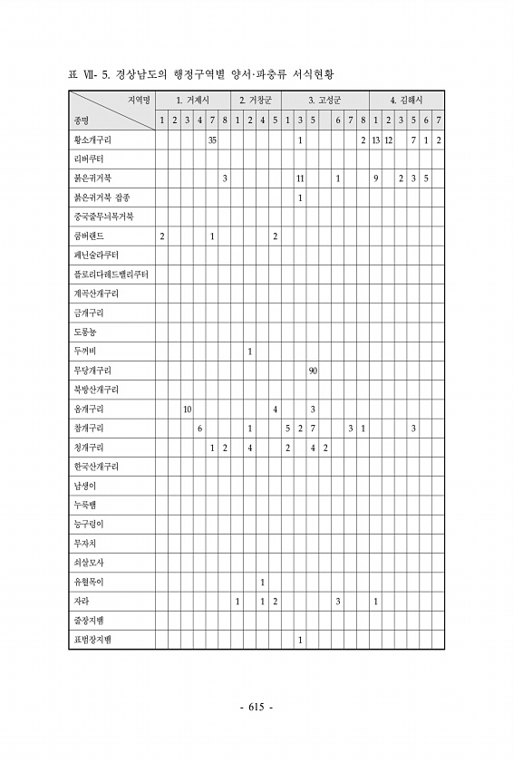 표 Ⅶ- 5. 경상남도의 행정구역별 양서·파충류 서식현황 지역명 종명 1. 거제시 2. 거창군 3. 고성군 4. 김해시 1 2 3 4 7 8 1 2 4 5 1 3 5 6 7 8 1 2 3 5 6 7 황소개구리 35 1 2 13 12 7 1 2 리버쿠터 붉은귀거북 3 11 1 9 2 3 5 붉은귀거북 잡종 1 중국줄무늬목거북 쿰버랜드 2 1 2 페닌술라쿠터 플로리다레드밸리쿠터 계곡산개구리 금개구리 도롱뇽 두꺼비 1 무당개구리 90 북방산개구리 옴개구리 10 4 3 참개구리 6 1 5 2 7 3 1 3 청개구리 1 2 4 2 4 2 한국산개구리 남생이 누룩뱀 능구렁이 무자치 쇠살모사 유혈목이 1 자라 1 1 2 3 1 줄장지뱀 표범장지뱀 1 615