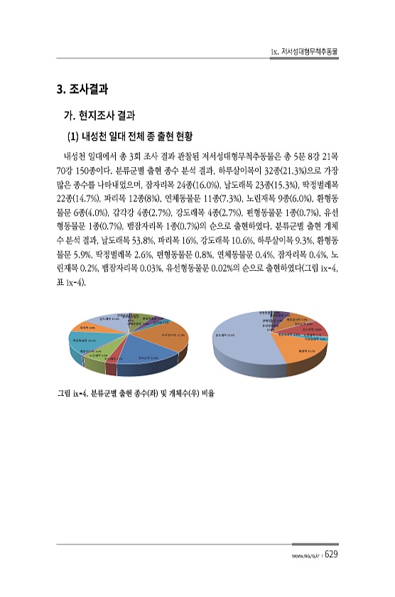ix. 저서성대형무척추동물 www.nie.re.kr ?629 3. 1 내성천 일대에서 총 3회 조사 결과 관찰된 저서성대형무척추동물은 총 5문 8강 21목 70강 150종이다. 분류군별 출현 종수 분석 결과, 하루살이목이 32종 21.3% 으로 가장 많은 종수를 나타내었으며, 잠자리목 24종 16.0% , 날도래목 23종 15.3% , 딱정벌레목 22종 14.7% , 파리목 12종 8% , 연체동물문 11종 7.3% , 노린재목 9종 6.0% , 환형동 물문 6종 4.0% , 갑각강 4종 2.7% , 강도래목 4종 2.7% , 편형동물문 1종 0.7% , 유선 형동물문 1종 0.7% , 뱀잠자리목 1종 0.7% 의 순으로 출현하였다. 분류군별 출현 개체 수 분석 결과, 날도래목 53.8%, 파리목 16%, ...