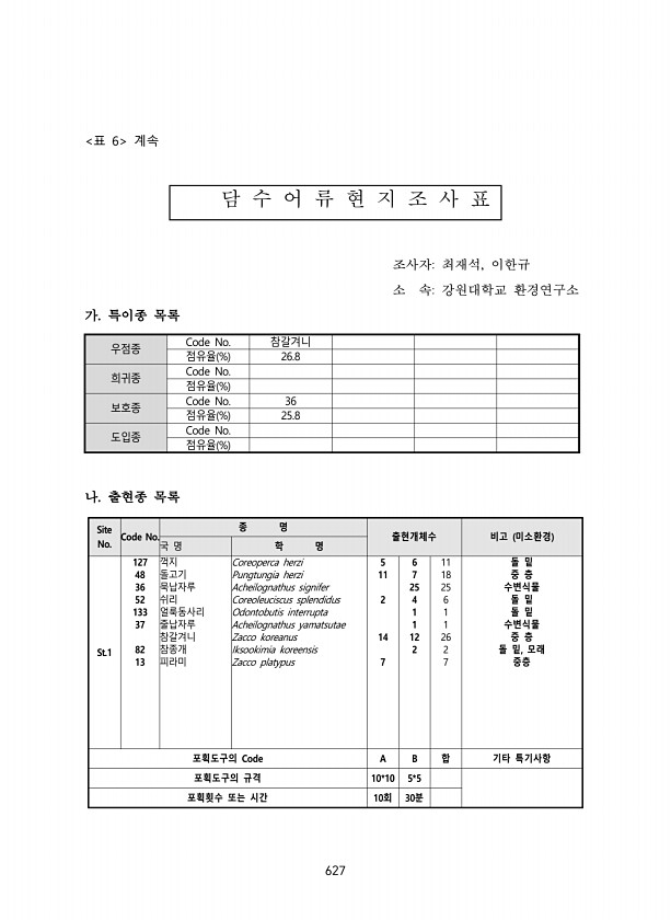 627 표 6 계속 담 수 어 류 현 지 조 사 표 조사자최재석, 이한규 소 속강원대학교 환경연구소 가. 특이종 목록 우점종 Code No. 참갈겨니 점유율 % 26.8 희귀종 Code No. 점유율 % 보호종 Code No. 36 점유율 % 25.8 도입종 Code No. 점유율 % 나. 출현종 목록 Site No. Code No. 종 명 출현개체수 비고 미소환경 국 명 학 명 St.1 127 꺽지 Coreoperca herzi 5 6 11 돌 밑 48 돌고기 Pungtungia herzi 11 7 18 중 층 36 묵납자루 Acheilognathus signifer 25 25 수변식물 52 쉬리 Coreoleuciscus splendidus 2 4 6 돌 밑 133 얼룩동사리 Odontobutis int...