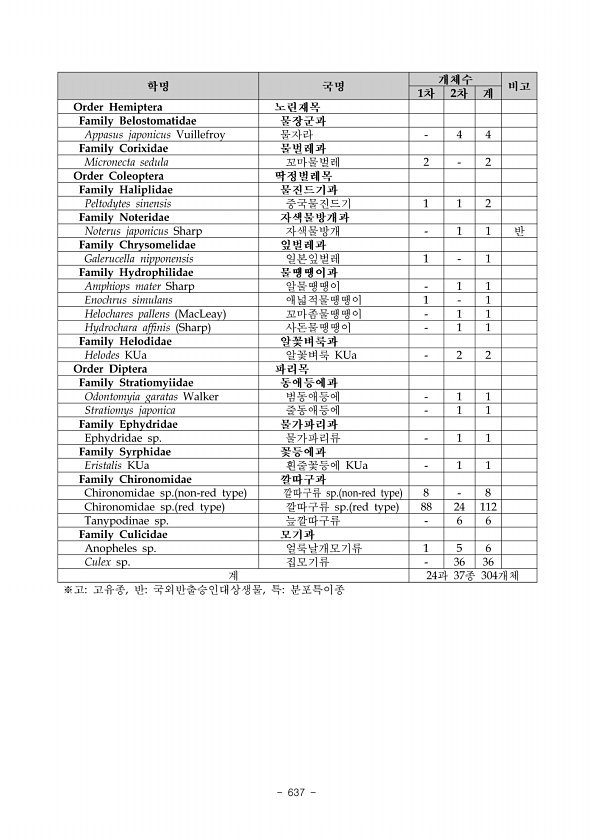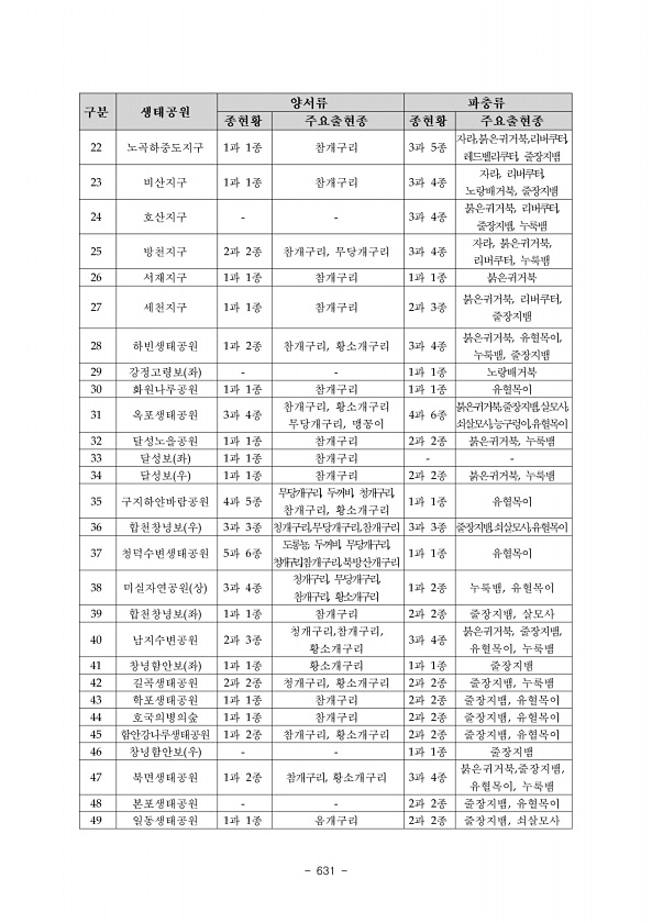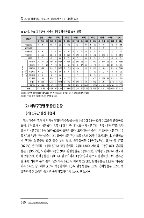 2018 생태·경관 우수지역 발굴조사 경북 내성천 일대 630 ? National Institute of Ecology 분류군 1구간 2구간 3구간 4구간 5구간 6구간 7구간 8구간 9구간 합계 종 개체 종 개체 종 개체 종 개체 종 개체 종 개체 종 개체 종 개체 종 개체 종 개체 편형동물문 1 26 1 167 1 26 1 148 1 33 1 11 1 137 1 4 1 ○ 1 551 유선형동물문 1 1 4 1 4 1 4 1 11 연체동물문 7 26 6 22 6 41 7 56 6 19 6 19 8 67 8 19 7 33 11 300 환형동물문 5 1,554 5 503 3 348 3 226 2 274 2 196 5 492 4 374 3 152 6 4,118 절 지 동 물 문 갑각강 2 ○ 3 ○ 1 ○ 3 ...