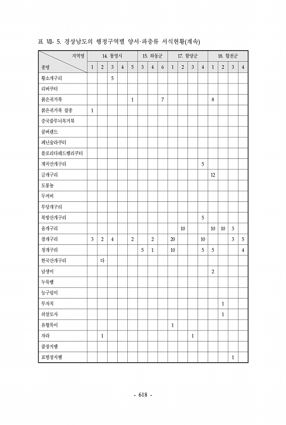 표 Ⅶ- 5. 경상남도의 행정구역별 양서·파충류 서식현황 계속 지역명 종명 14. 통영시 15. 하동군 17. 함양군 18. 합천군 1 2 3 4 5 3 4 6 1 2 3 4 1 2 3 4 황소개구리 5 리버쿠터 붉은귀거북 1 7 8 붉은귀거북 잡종 1 중국줄무늬목거북 쿰버랜드 페닌술라쿠터 플로리다레드밸리쿠터 계곡산개구리 5 금개구리 12 도롱뇽 두꺼비 무당개구리 북방산개구리 5 옴개구리 10 10 10 3 참개구리 3 2 4 2 2 20 10 3 5 청개구리 5 1 10 5 5 4 한국산개구리 다 남생이 2 누룩뱀 능구렁이 무자치 1 쇠살모사 1 유혈목이 1 자라 1 1 줄장지뱀 표범장지뱀 1 618