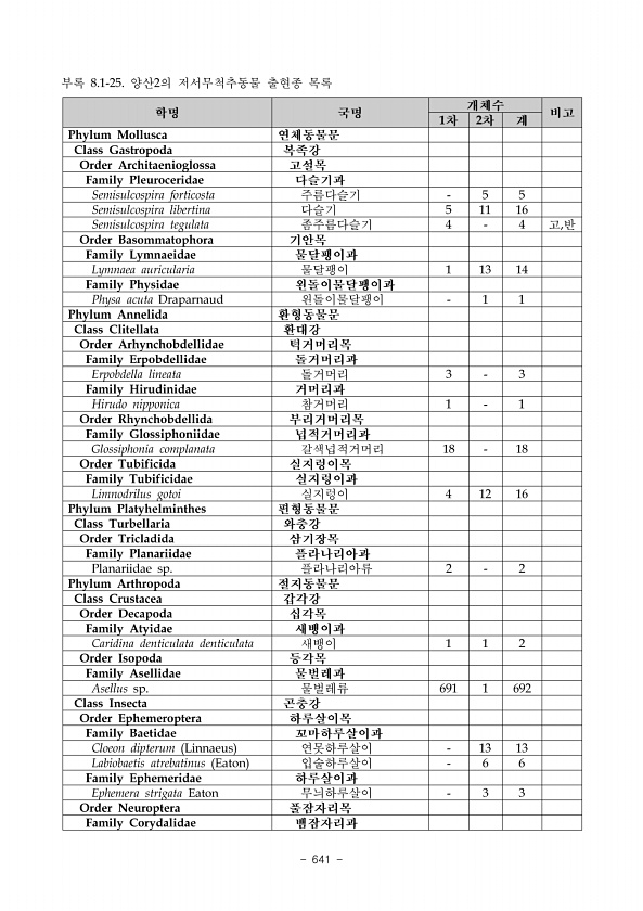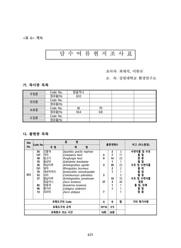 631 표 6 계속 담 수 어 류 현 지 조 사 표 조사자최재석, 이한규 소 속강원대학교 환경연구소 가. 특이종 목록 우점종 Code No. 참갈겨니 점유율 % 32.0 희귀종 Code No. 점유율 % 보호종 Code No. 36 70 점유율 % 18.4 0.8 도입종 Code No. 점유율 % 나. 출현종 목록 Site No. Code No. 종 명 출현개체수 비고 미소환경 국 명 학 명 St.5 56 긴몰개 Squalidus gracilis majimae 2 2 수변식물 및 수초 127 꺽지 Coreoperca herzi 4 7 11 돌 밑 48 돌고기 Pungtungia herzi 9 14 23 중 층 70 돌상어 Gobiobotia brevibarba 1 1 돌 밑 36 묵납자루 Acheilogna...