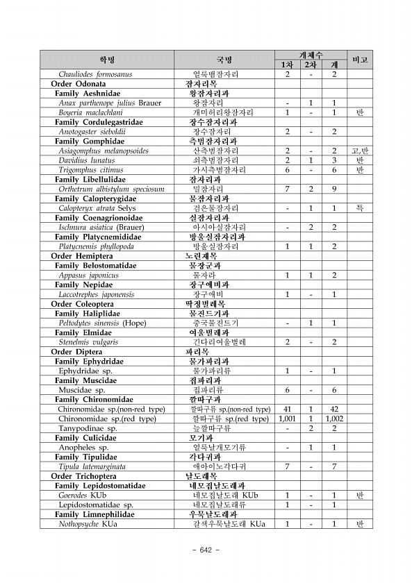 2018 생태·경관 우수지역 발굴조사 경북 내성천 일대 634 ? National Institute of Ecology 4 미호교습지 일대의 저서성대형무척추동물은 총 4문 7강 16목 53과 87종이 출현하였 으며, 1차 조사 시 4문 7강 14목 40과 57종, 2차 조사 시 4문 7강 14목 36과 49종, 3차 조사 시 4문 7강 15목 40과 57종이 출현하였다. 또한 미호교습지 1지점에서 4문 7강 16 목 49과 76종, 미호교습지 1지점에서 4문 7강 15목 48과 73종이 조사되었다. 미호교습 지 구간의 분류군별 출현 종수 분석 결과, 하루살이목 19종 21.8% , 잠자리목 14종 16.1% , 날도래목 13종 14.9% , 딱정벌레목 10종 11.5% , 파리목 9종 10.3% , 연체동 ...