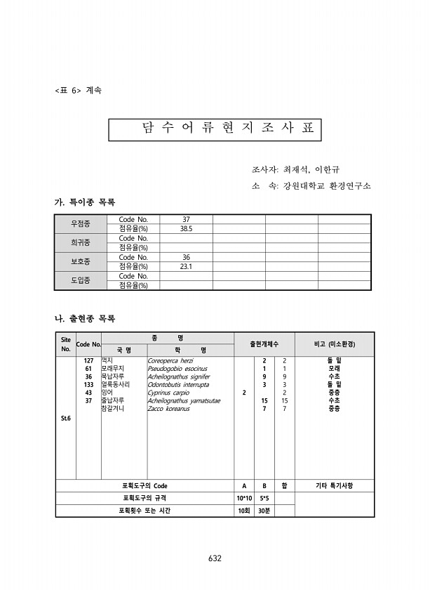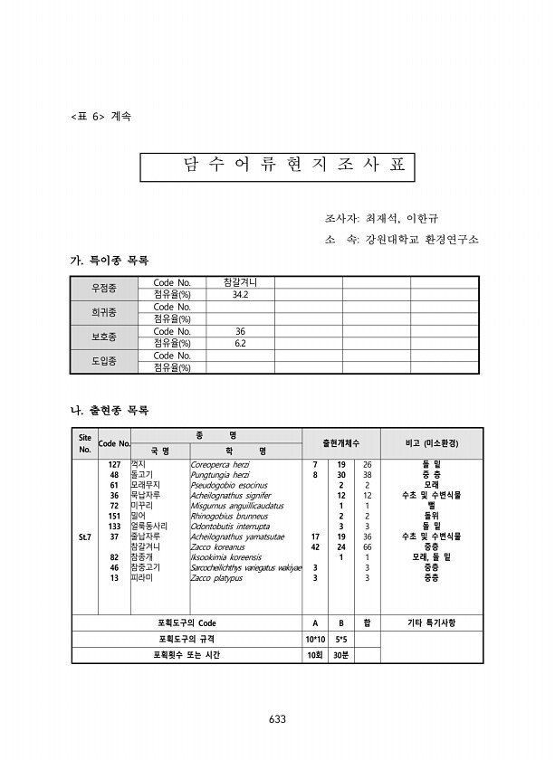 633 표 6 계속 담 수 어 류 현 지 조 사 표 조사자최재석, 이한규 소 속강원대학교 환경연구소 가. 특이종 목록 우점종 Code No. 참갈겨니 점유율 % 34.2 희귀종 Code No. 점유율 % 보호종 Code No. 36 점유율 % 6.2 도입종 Code No. 점유율 % 나. 출현종 목록 Site No. Code No. 종 명 출현개체수 비고 미소환경 국 명 학 명 St.7 127 꺽지 Coreoperca herzi 7 19 26 돌 밑 48 돌고기 Pungtungia herzi 8 30 38 중 층 61 모래무지 Pseudogobio esocinus 2 2 모래 36 묵납자루 Acheilognathus signifer 12 12 수초 및 수변식물 72 미꾸리 Misgurnus anguillic...