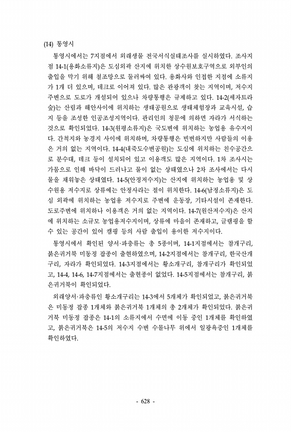 14 통영시 통영시에서는 7지점에서 외래생물 전국서식실태조사를 실시하였다. 조사지 점 14-1 용화소류지 은 도심외곽 산지에 위치한 상수원보호구역으로 외부인의 출입을 막기 위해 철조망으로 둘러싸여 있다. 용화사와 인접한 지점에 소류지 가 1개 더 있으며, 데크로 이어져 있다. 많은 관광객이 찾는 지역이며, 저수지 주변으로 도로가 개설되어 있으나 차량통행은 규제하고 있다. 14-2 세자트라 숲 는 산림과 해안사이에 위치하는 생태공원으로 생태체험장과 교육시설, 습 지 등을 조성한 인공조성지역이다. 관리인의 청문에 의하면 자라가 서식하는 것으로 확인되었다. 14-3 원평소류지 은 국도변에 위치하는 농업용 유수지이 다. 간척지와 농경지 사이에 위치하며, 차량통행은 빈번하지만 사람들의 이용 은 거의 없는 지역이다. ...