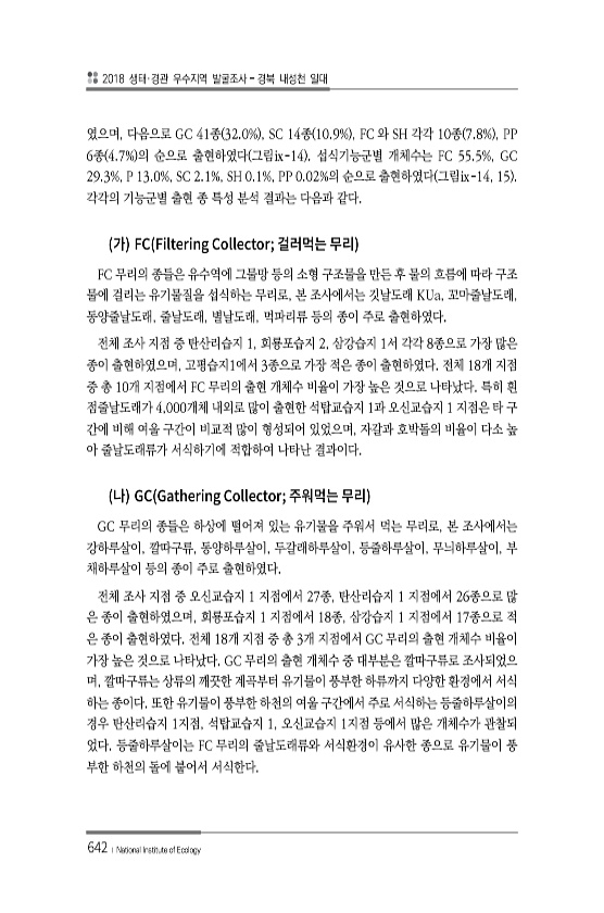 2018 생태·경관 우수지역 발굴조사 경북 내성천 일대 642 ? National Institute of Ecology 였으며, 다음으로 GC 41종 32.0% , SC 14종 10.9% , FC 와 SH 각각 10종 7.8% , PP 6종 4.7% 의 순으로 출현하였다 그림ⅸ-14 섭식기능군별 개체수는 FC 55.5%, GC 29.3%, P 13.0%, SC 2.1%, SH 0.1%, PP 0.02%의 순으로 출현하였다 그림ⅸ-14, 15 각각의 기능군별 출현 종 특성 분석 결과는 다음과 같다. FC Filtering Collector; FC 무리의 종들은 유수역에 그물망 등의 소형 구조물을 만든 후 물의 흐름에 따라 구조 물에 걸리는 유기물질을 섭식하는 무리로, 본 조사에서는 깃날도래 KUa, 꼬마줄날도...