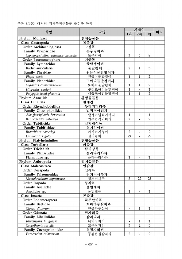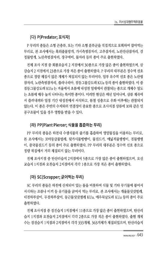 ix. 저서성대형무척추동물 www.nie.re.kr ?643 P Predator; P 무리의 종들은 소형 곤충류, 또는 기타 소형 분류군을 직접적으로 포획하여 잡아먹는 무리로, 본 조사에서는 혹외줄물방개, 가시측범잠자리, 고추잠자리, 노란잔산잠자리, 검 정물방개, 노란측범잠자리, 장구애비, 물자라 등의 종이 주로 출현하였다. 전체 조사 지점 중 회룡포습지 2 지점에서 30종으로 가장 많은 종이 출현하였으며, 삼 강습지 2 지점에서 23종으로 가장 적은 종이 출현하였다. P 무리의 대부분은 정수역 선호 종으로 정량 채집시 많은 개체가 채집되지 않는 무리이다. 일부 유수역 선호 종은 노란뱀 잠자리, 노란측범잠자리, 플라나리아, 점등그물강도래 KUa 등의 종이 출현하였다. 이 중 점등그물강도래 KUa 는 겨울에서...