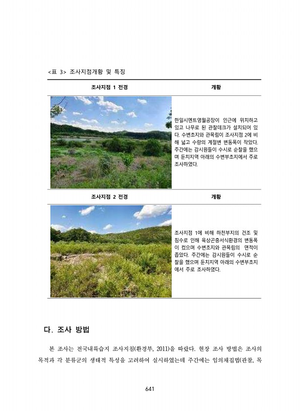 641 조사지점 1 전경 개황 한일시멘트영월공장이 인근에 위치하고 있고 나무로 된 관찰데크가 설치되어 있 다. 수변초지와 관목림이 조사지점 2에 비 해 넓고 수량의 계절변 변동폭이 작았다. 주간에는 감시원들이 수시로 순찰을 했으 며 둔치지역 아래의 수변부초지에서 주로 조사하였다. 조사지점 2 전경 개황 조사지점 1에 비해 하천부지의 건조 및 침수로 인해 육상곤충서식환경의 변동폭 이 컸으며 수변초지와 관목림의 면적이 좁았다. 주간에는 감시원들이 수시로 순 찰을 했으며 둔치지역 아래의 수변부초지 에서 주로 조사하였다. 표 3 조사지점개황 및 특징 다. 조사 방법 본 조사는 전국내륙습지 조사지침 환경부, 2011 을 따랐다. 현장 조사 방법은 조사의 목적과 각 분류군의 생태적 특성을 고려하여 실시하였는데 주간에는...