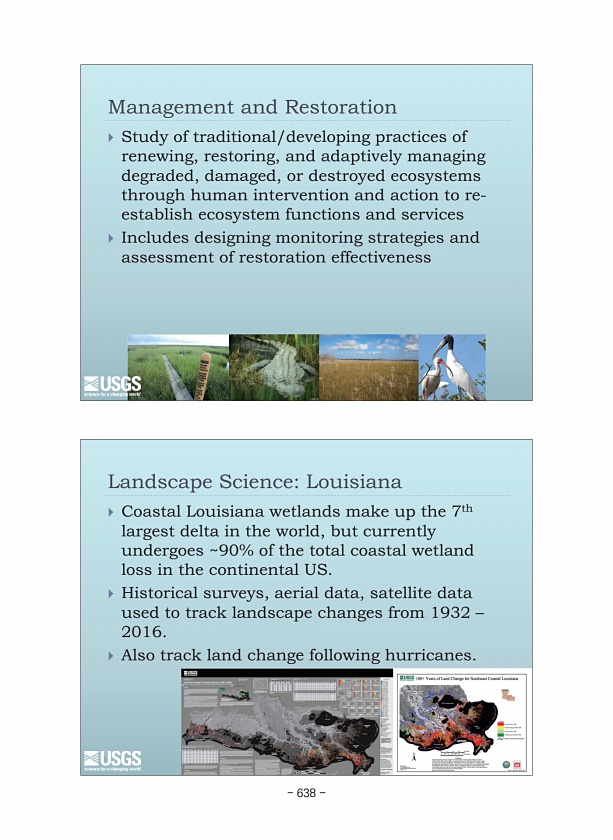 Landscape ScienceLouisiana ? Coastal Louisiana wetlands make up the 7th largest delta in the world, but currently undergoes 90% of the total coastal wetland loss in the continental US. ? Historical surveys, aerial data, satellite data used to track landscape changes from 1932 ? 2016. ? Also track land change following hurricanes. Management and Restoration ? Study of traditional/developing practic...