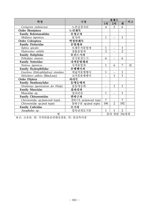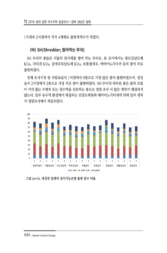 2018 생태·경관 우수지역 발굴조사 경북 내성천 일대 644 ? National Institute of Ecology 1지점과 2지점에서 각각 4개체로 출현개체수가 적었다. SH Shredder; SH 무리의 종들은 식물의 잔사체를 썰어 먹는 무리로, 본 조사에서는 네모집날도래 KUa, 각다귀 KUa, 갈색우묵날도래 KUa, 보통옆새우, 애아이노각다귀 등의 종이 주로 출현하였다. 전체 조사지점 중 석탑교습지 1지점에서 9종으로 가장 많은 종이 출현하였으며, 경진 습지 2지점에서 2종으로 가장 적은 종이 출현하였다. SH 무리의 대부분 종은 물의 흐름 이 거의 없는 수변부 또는 정수역을 선호하는 종으로 정량 조사 시 많은 개체가 채집되지 않는다. 일부 유수역 환경에서 채집되는 민강도래류와 애아이노각다귀에 의...