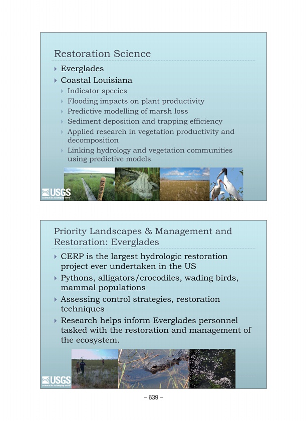Priority Landscapes & Management and RestorationEverglades ? CERP is the largest hydrologic restoration project ever undertaken in the US ? Pythons, alligators/crocodiles, wading birds, mammal populations ? Assessing control strategies, restoration techniques ? Research helps inform Everglades personnel tasked with the restoration and management of the ecosystem. Restoration Science ? Everglades ?...