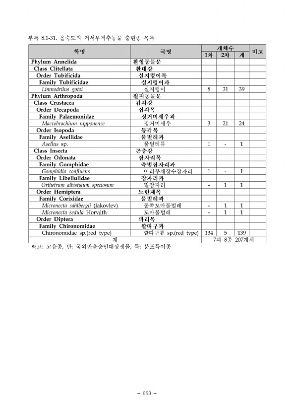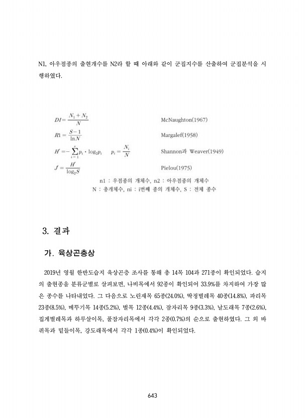 643 N1, 아우점종의 출현개수를 N2라 할 때 아래와 같이 군집지수를 산출하여 군집분석을 시 행하였다. 3. 결과 가. 육상곤충상 2019년 영월 한반도습지 육상곤층 조사를 통해 총 14목 104과 271종이 확인되었다. 습지 의 출현종을 분류군별로 살펴보면, 나비목에서 92종이 확인되어 33.9%를 차지하여 가장 많 은 종수를 나타내었다. 그 다음으로 노린재목 65종 24.0% , 딱정벌레목 40종 14.8% , 파리목 23종 8.5% , 메뚜기목 14종 5.2% , 벌목 12종 4.4% , 잠자리목 9종 3.3% , 날도래목 7종 2.6% , 집게벌레목과 하루살이목, 풀잠자리목에서 각각 2종 0.7% 의 순으로 출현하였다. 그 외 바 퀴목과 밑들이목, 강도래목에서 각각 1종 0.4% 이확인되었다.