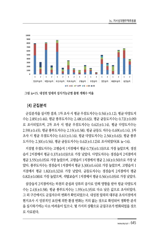 ix. 저서성대형무척추동물 www.nie.re.kr ?645 그림 ⅸ-15. 내성천 일대의 섭식기능군별 출현 개체수 비율 4 군집분석을 실시한 결과, 1차 조사 시 평균 우점도지수는 0.56 ±0.12 , 평균 다양도지 수는 2.85 ±0.46 , 평균 풍부도지수는 2.48 ±0.63 , 평균 균등도지수는 0.72 ±0.09 로 조사되었으며, 2차 조사 시 평균 우점도지수는 0.62 ±0.14 , 평균 다양도지수는 2.59 ±0.45 , 평균 풍부도지수는 2.15 ±0.58 , 평균 균등도 지수는 0.69 ±0.14 , 3차 조사 시 평균 우점도지수는 0.61 ±0.16 , 평균 다양도지수는 2.56 ±0.63 , 평균 풍부 도지수는 2.30 ±0.56 , 평균 균등도지수는 0.62 ±0.12 로 조사되었다...