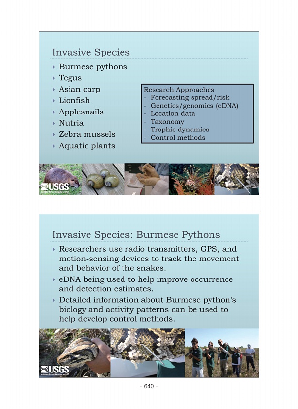 Invasive SpeciesBurmese Pythons ? Researchers use radio transmitters, GPS, and motion-sensing devices to track the movement and behavior of the snakes. ? eDNA being used to help improve occurrence and detection estimates. ? Detailed information about Burmese python’s biology and activity patterns can be used to help develop control methods. Invasive Species ? Burmese pythons ? Tegus ? Asian carp ?...