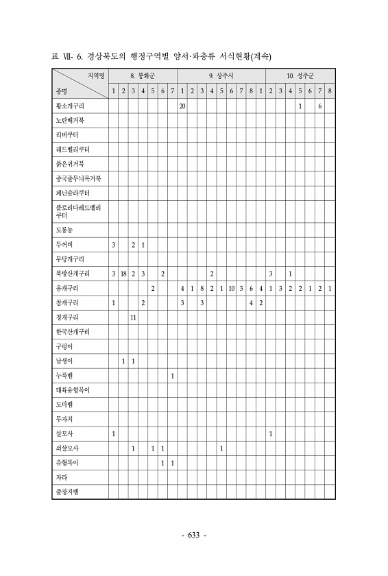표 Ⅶ- 6. 경상북도의 행정구역별 양서·파충류 서식현황 계속 지역명 종명 8. 봉화군 9. 상주시 10. 성주군 1 2 3 4 5 6 7 1 2 3 4 5 6 7 8 1 2 3 4 5 6 7 8 황소개구리 20 1 6 노란배거북 리버쿠터 레드벨리쿠터 붉은귀거북 중국줄무늬목거북 페닌슐라쿠터 플로리다레드벨리 쿠터 도롱뇽 두꺼비 3 2 1 무당개구리 북방산개구리 3 18 2 3 2 2 3 1 옴개구리 2 4 1 8 2 1 10 3 6 4 1 3 2 2 1 2 1 참개구리 1 2 3 3 4 2 청개구리 11 한국산개구리 구렁이 남생이 1 1 누룩뱀 1 대륙유혈목이 도마뱀 무자치 살모사 1 1 쇠살모사 1 1 1 1 유혈목이 1 1 자라 줄장지뱀 633