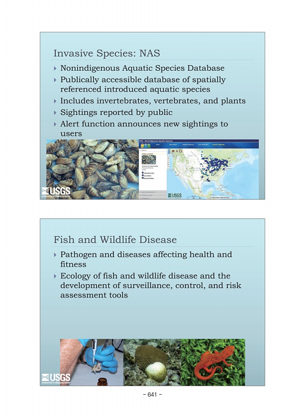 Fish and Wildlife Disease ? Pathogen and diseases affecting health and fitness ? Ecology of fish and wildlife disease and the development of surveillance, control, and risk assessment tools Invasive SpeciesNAS ? Nonindigenous Aquatic Species Database ? Publically accessible database of spatially referenced introduced aquatic species ? Includes invertebrates, vertebrates, and plants ? Sightings rep...