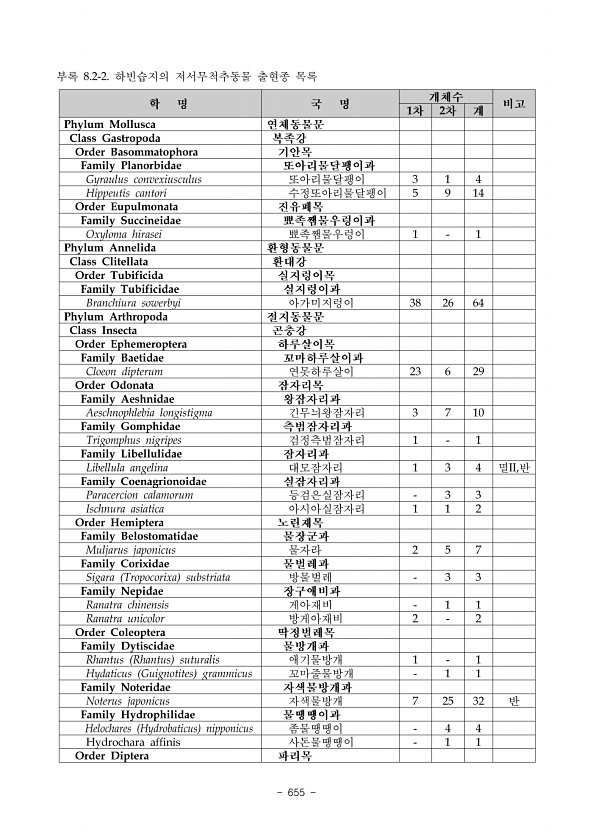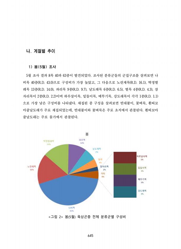 645 나. 계절별 추이 1 봄 5월 조사 5월 조사 결과 8목 40과 63종이 발견되었다. 조사된 분류군들의 군집구조를 살펴보면 나 비목 40종 R.D. 43.0 으로 구성비가 가장 높았고, 그 다음으로 노린재목 R.D. 16.1 , 딱정벌 레목 13종 R.D. 14.0 , 파리목 9종 R.D. 9.7 , 날도래목 6종 R.D. 6.5 , 벌목 4종 R.D. 4.3 , 잠 자리목이 2종 R.D. 2.2 이며 하루살이목, 밑들이목, 메뚜기목, 강도래목이 각각 1종 R.D. 1.1 으로 가장 낮은 구성비를 나타냈다. 채집된 종 구성을 살펴보면 빈대붙이, 꽃벼룩, 흰띠꼬 마줄날도래가 주로 채집되었는데, 빈대붙이와 꽃벼룩은 주로 초지에서 관찰된다. 흰띠꼬마 줄날도래는 주로 물가에서 관찰된다. 그림 2 봄 5월 육...