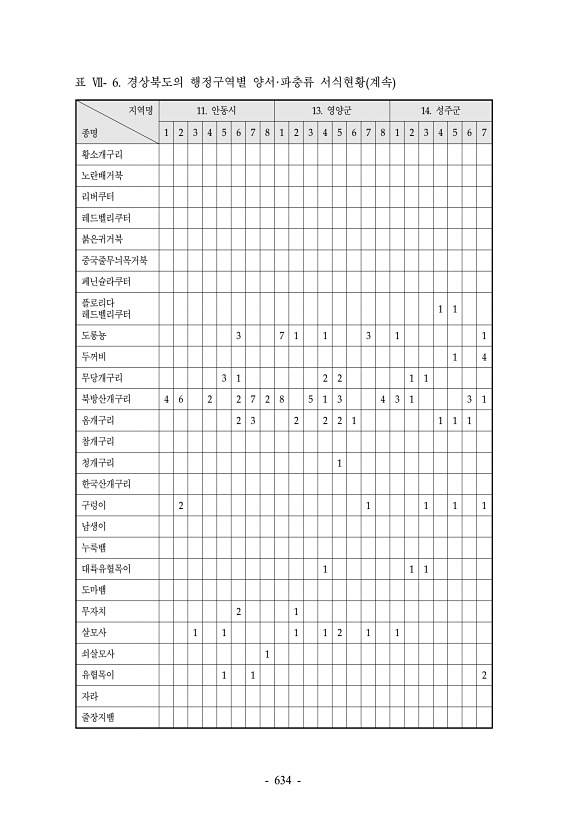 표 Ⅶ- 6. 경상북도의 행정구역별 양서·파충류 서식현황 계속 지역명 종명 11. 안동시 13. 영양군 14. 성주군 1 2 3 4 5 6 7 8 1 2 3 4 5 6 7 8 1 2 3 4 5 6 7 황소개구리 노란배거북 리버쿠터 레드벨리쿠터 붉은귀거북 중국줄무늬목거북 페닌슐라쿠터 플로리다 레드벨리쿠터 1 1 도롱뇽 3 7 1 1 3 1 1 두꺼비 1 4 무당개구리 3 1 2 2 1 1 북방산개구리 4 6 2 2 7 2 8 5 1 3 4 3 1 3 1 옴개구리 2 3 2 2 2 1 1 1 1 참개구리 청개구리 1 한국산개구리 구렁이 2 1 1 1 1 남생이 누룩뱀 대륙유혈목이 1 1 1 도마뱀 무자치 2 1 살모사 1 1 1 1 2 1 1 쇠살모사 1 유혈목이 1 1 2 자라 줄장지뱀 634