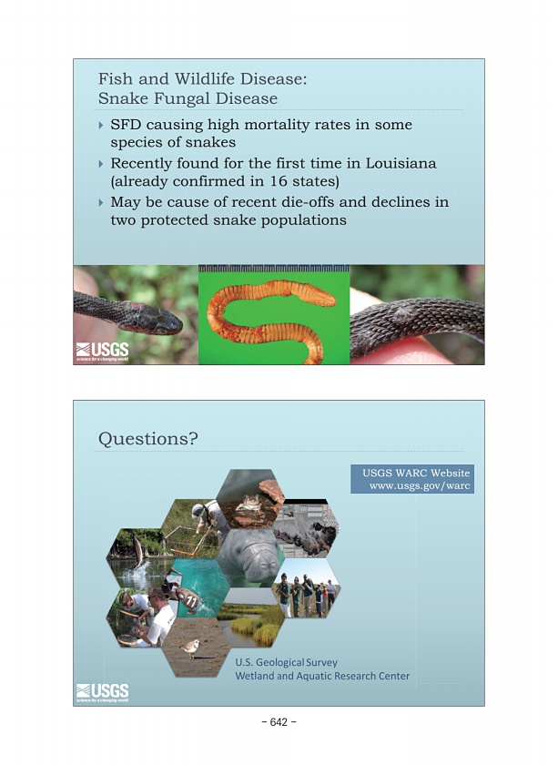 Questions? USGS WARC Website www.usgs.gov/warc Fish and Wildlife DiseaseSnake Fungal Disease ? SFD causing high mortality rates in some species of snakes ? Recently found for the first time in Louisiana already confirmed in 16 states ? May be cause of recent die-offs and declines in two protected snake populations 642