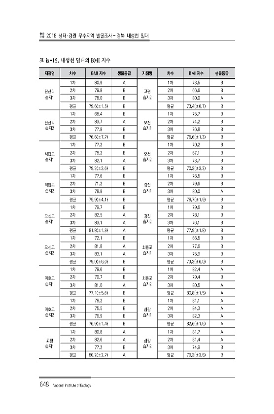 2018 생태·경관 우수지역 발굴조사 경북 내성천 일대 648 ? National Institute of Ecology 지점명 차수 BMI 지수 생물등급 지점명 차수 BMI 지수 생물등급 탄산리 습지1 1차 80.9 A 고평 습지2 1차 73.5 B 2차 79.8 B 2차 66.6 B 3차 78.0 B 3차 80.0 A 평균 79.6 ±1.5 B 평균 73.4 ±6.7 B 탄산리 습지2 1차 68.4 B 오천 습지1 1차 75.7 B 2차 83.7 A 2차 74.2 B 3차 77.8 B 3차 76.8 B 평균 76.6 ±7.7 B 평균 75.6 ±1.3 B 석탑교 습지1 1차 77.2 B 오천 습지2 1차 70.2 B 2차 78.2 B 2차 67.1 B 3차 82.1 A 3차 73.7 B 평균 79.2 ±2...