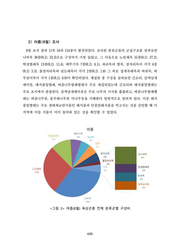 646 2 여름 8월 조사 8월 조사 결과 11목 54과 114종이 발견되었다. 조사된 분류군들의 군집구조를 살펴보면 나비목 38종 R.D. 33.3 으로 구성비가 가장 높았고, 그 다음으로 노린재목 31종 R.D. 27.2 , 딱정벌레목 13종 R.D. 11.4 , 메뚜기목 7종 R.D. 6.1 , 파리목과 벌목, 잠자리목이 각각 6종 R.D. 5.3 , 풀잠자리목과 날도래목이 각각 2종 R.D. 1.8 그 외로 집게목레목과 바퀴목, 하 루살이목이 각각 1종 R.D. 0.9 이 확인되었다. 채집된 종 구성을 살펴보면 긴꼬리, 갈색날개 매미충, 돼지풀잎벌레, 버즘나무방패벌레가 주로 채집되었는데 긴꼬리와 돼지풀잎벌레는 주로 초지에서 관찰된다. 갈색날개매미충은 주로 나무의 가지를 흡즙하고, 버즘나무방패벨 레는 ...