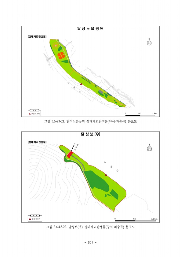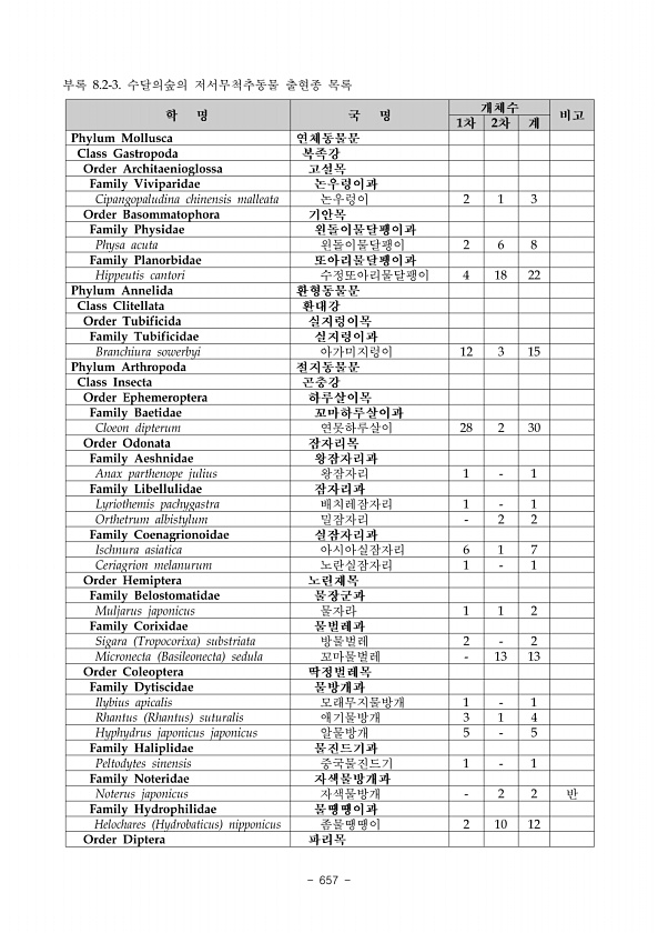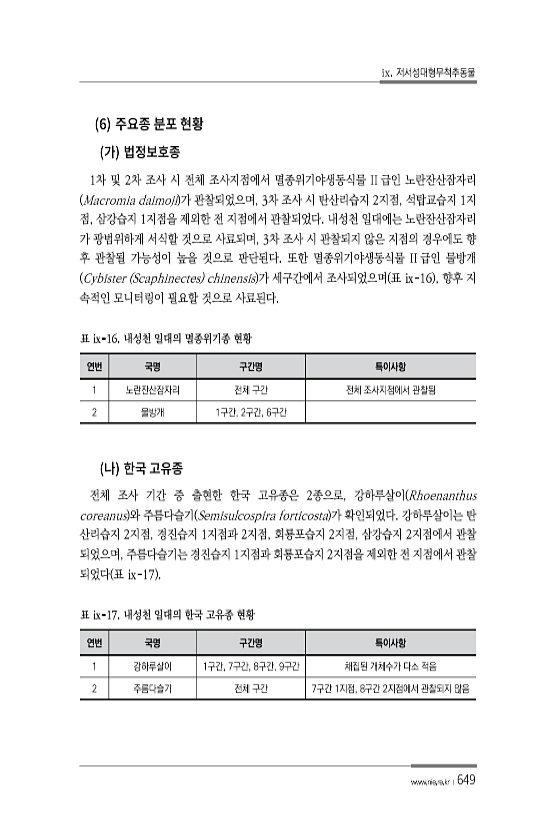 ix. 저서성대형무척추동물 www.nie.re.kr ?649 6 1차 및 2차 조사 시 전체 조사지점에서 멸종위기야생동식물 II 급인 노란잔산잠자리 Macromia daimoji 가 관찰되었으며, 3차 조사 시 탄산리습지 2지점, 석탑교습지 1지 점, 삼강습지 1지점을 제외한 전 지점에서 관찰되었다. 내성천 일대에는 노란잔산잠자리 가 광범위하게 서식할 것으로 사료되며, 3차 조사 시 관찰되지 않은 지점의 경우에도 향 후 관찰될 가능성이 높을 것으로 판단된다. 또한 멸종위기야생동식물 II 급인 물방개 Cybister Scaphinectes chinensis 가 세구간에서 조사되었으며 표 ⅸ-16 , 향후 지 속적인 모니터링이 필요할 것으로 사료된다. 연번 국명 구간명 특이사항 1 노란잔산잠자리 전체 구간 전체...