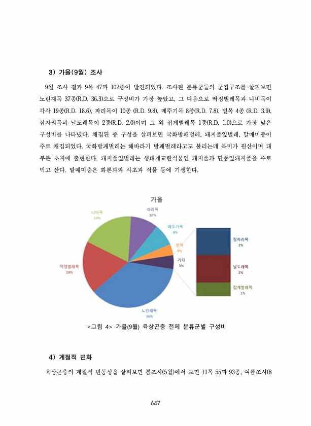 647 3 가을 9월 조사 9월 조사 결과 9목 47과 102종이 발견되었다. 조사된 분류군들의 군집구조를 살펴보면 노린재목 37종 R.D. 36.3 으로 구성비가 가장 높았고, 그 다음으로 딱정벌레목과 나비목이 각각 19종 R.D. 18.6 , 파리목이 10종 R.D. 9.8 , 메뚜기목 8종 R.D. 7.8 , 벌목 4종 R.D. 3.9 , 잠자리목과 날도래목이 2종 R.D. 2.0 이며 그 외 집게벌레목 1종 R.D. 1.0 으로 가장 낮은 구성비를 나타냈다. 채집된 종 구성을 살펴보면 국화방패벌레, 돼지풀잎벌레, 말매미충이 주로 채집되었다. 국화방패벌레는 해바라기 방패벌레라고도 불리는데 북미가 원산이며 대 부분 초지에 출현한다. 돼지풀잎벌레는 생태계교란식물인 돼지풀과 단풍잎돼지풀을 주로 먹고 산다. ...
