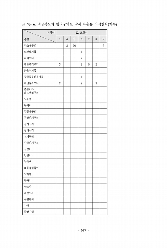 표 Ⅶ- 6. 경상북도의 행정구역별 양서·파충류 서식현황 계속 지역명 종명 22. 포항시 1 4 5 6 7 8 9 황소개구리 2 30 2 노란배거북 1 리버쿠터 2 레드벨리쿠터 3 2 9 2 붉은귀거북 중국줄무늬목거북 1 페닌슐라쿠터 2 2 3 플로리다 레드벨리쿠터 도롱뇽 두꺼비 무당개구리 북방산개구리 옴개구리 참개구리 청개구리 한국산개구리 구렁이 남생이 누룩뱀 대륙유혈목이 도마뱀 무자치 살모사 쇠살모사 유혈목이 자라 줄장지뱀 637