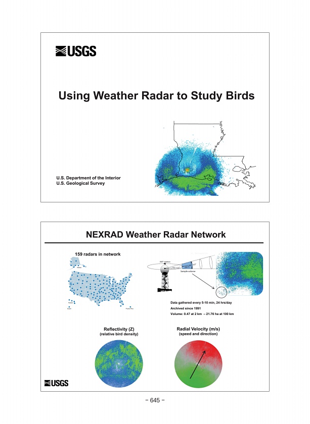 NEXRAD Weather Radar Network Data gathered every 5-10 min, 24 hrs/day 159 radars in network Archived since 1991 Reflectivity Z relative bird density Radial Velocity m/s speed and direction Volume0.47 at 2 km ? 21.76 ha at 100 km Using Weather Radar to Study Birds U.S. Department of the Interior U.S. Geological Survey 645