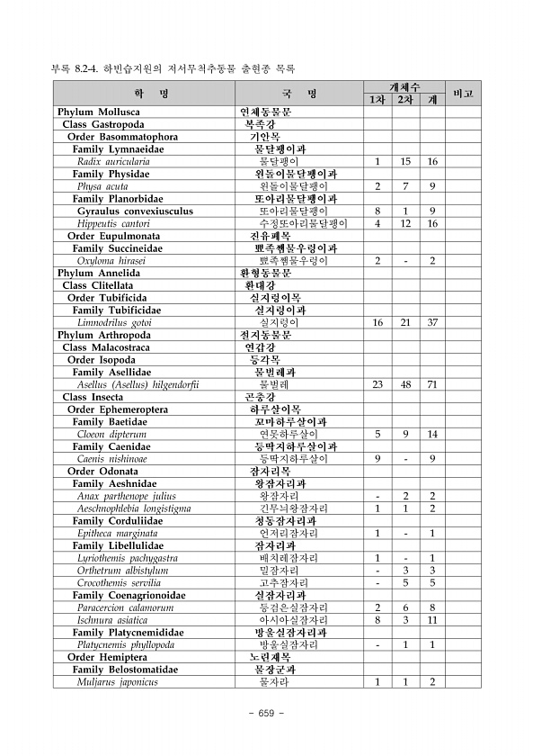 650 조사지점 1은 조사지점 2에 비해 식생의 다양성이 높고 초지의 면적이 높았을 뿐 아니라 수량에 의한 서식지의 변화폭이 작아 보였으나 여름을 제외한 대부분의 군집분석지수가 육상곤충의 서식에 적합하지 않게 나왔다. 그 이유로 인근의 한일시멘트영월공장의 분진의 영향으로 추정된다. 시멘트의 주원료에 규조토가 사용된다고 알려져 있는데 Tagnit-Hamou and Luke, 2003 , 규조토 diatomite 는 곤충에 대한 물리적 살상력이 증명되 어 왔다 Koruni?, 2013 인근의 시멘트공장과 그 주변의 육상곤충에 대한 직접적인 인과 관계는 추가연구가 필요하다. 라. 문헌자료와의 비교 출현종수 문헌 조사 결과 한반도습지에 대한 조사는 환경부 2014 에 의한 것이 대표적으로 습지보 호지역 정밀조사를 ...