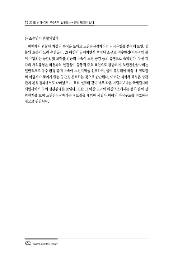 2018 생태·경관 우수지역 발굴조사 경북 내성천 일대 652 ? National Institute of Ecology 는 소수만이 관찰되었다. 현재까지 관찰된 지점의 특성을 토대로 노란잔산잠자리의 서식유형을 분석해 보면, 1 물의 흐름이 느린 수변공간, 2 하천이 굽이치면서 형성된 소규모 정수환경 지속적인 물 이 유입되는 공간 , 3 모래톱 인근의 유속이 느린 공간 등의 유형으로 축약된다. 우선 각 각의 서식유형은 하천과의 연결성이 공통적 주요 요인으로 판단되며, 노란잔산잠자리는 일반적으로 유수 환경 중에 유속이 느린지역을 선호하며, 물이 유입되어 하상 내 점토질 의 미립자가 쌓이지 않는 공간을 선호하는 것으로 판단된다. 이러한 서식처 특성은 상관 관계 분석 결과에서도 나타났으며, 특히 실트와 같이 매우 ...