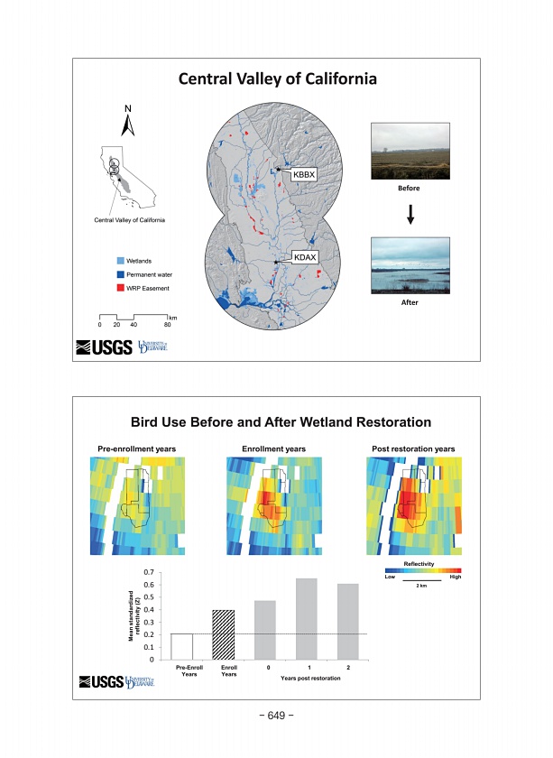 0 0.1 0.2 0.3 0.4 0.5 0.6 0.7 Mean standardized reflectivity Z Pre-Enroll Years Pre-enrollment years Enrollment years Post restoration years 2 km Years post restoration Enroll 0 1 2 Years Low High Reflectivity Bird Use Before and After Wetland Restoration Central Valley of California Before After 649