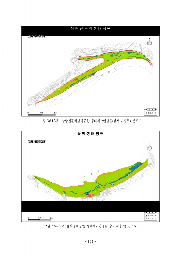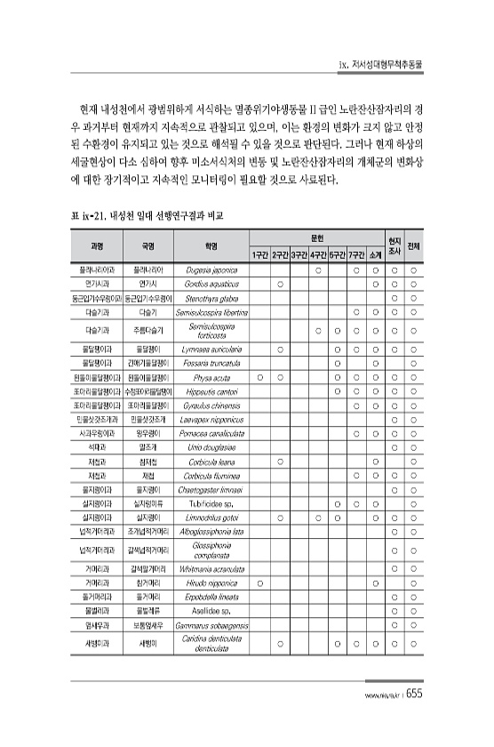 ix. 저서성대형무척추동물 www.nie.re.kr ?655 현재 내성천에서 광범위하게 서식하는 멸종위기야생동물 II 급인 노란잔산잠자리의 경 우 과거부터 현재까지 지속적으로 관찰되고 있으며, 이는 환경의 변화가 크지 않고 안정 된 수환경이 유지되고 있는 것으로 해석될 수 있을 것으로 판단된다. 그러나 현재 하상의 세굴현상이 다소 심하여 향후 미소서식처의 변동 및 노란잔산잠자리의 개체군의 변화상 에 대한 장기적이고 지속적인 모니터링이 필요할 것으로 사료된다. 과명 국명 학명 문헌 현지 1구간 2구간 3구간 4구간 5구간 7구간 소계 조사 전체 플라나리아과 플라나리아 Dugesia japonica ○ ○ ○ ○ ○ 연가시과 연가시 Gordius aquaticus ○ ○ ○ ○ 둥근입기수우렁이과 둥근입기수우렁이...