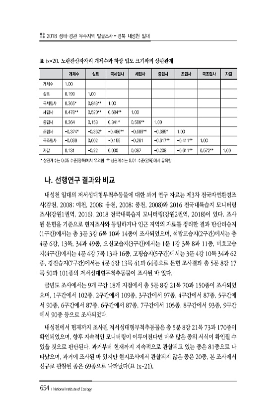 2018 생태·경관 우수지역 발굴조사 경북 내성천 일대 654 ? National Institute of Ecology 개체수 실트 극세립사 세립사 중립사 조립사 극조립사 자갈 개체수 1.00 실트 0.199 1.00 극세립사 0.365* 0.843** 1.00 세립사 0.478** 0.520** 0.684** 1.00 중립사 0.264 0.153 0.341* 0.586** 1.00 조립사 -0.374* -0.362* -0.486** -0.609** -0.385* 1.00 극조립사 -0.030 0.002 -0.155 -0.261 -0.617** -0.411** 1.00 자갈 0.131 -0.22 0.030 0.087 -0.208 -0.611** 0.572** 1.00 표 ⅸ-20. 노란잔산자자리 개체수와 하...