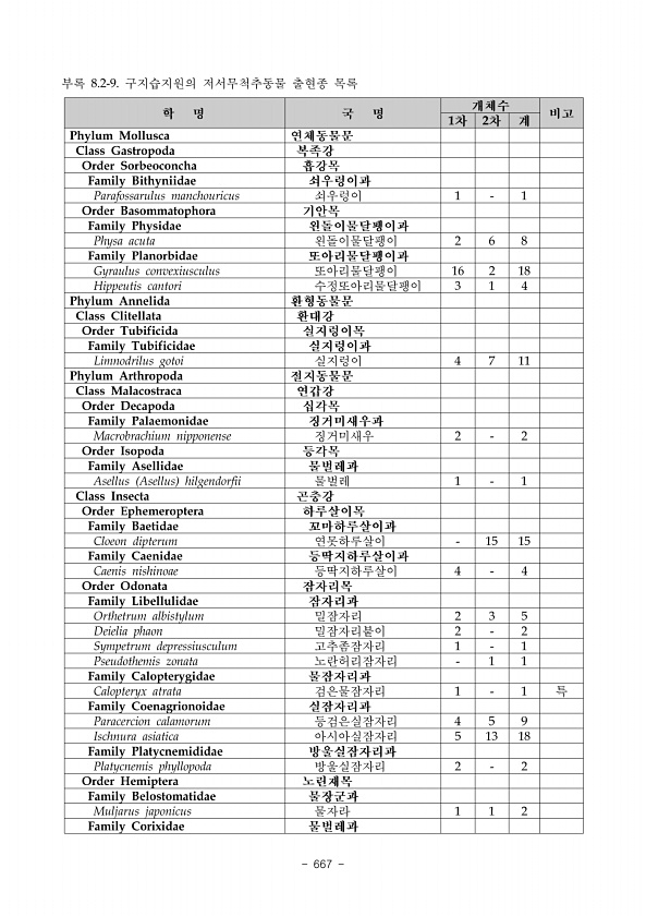 ix. 저서성대형무척추동물 www.nie.re.kr ?659 과명 국명 학명 문헌 현지 1구간 2구간 3구간 4구간 5구간 7구간 소계 조사 전체 물땡땡이과 사돈물땡땡이 Hydrochara affinis ○ ○ 물땡땡이과 꼬마넓적물땡땡이 Enochrus esuriens ○ ○ ○ 여울벌레과 여울벌레류 Elmidae sp. ○ ○ ○ ○ 여울벌레과 긴다리여울벌레 Stenelmis vulgaris ○ ○ ○ 물삿갓벌레과 넓은물삿갓벌레 KUa Mataeopsephus KUa ○ ○ 물삿갓벌레과 개울물삿갓벌레 Psephenoides japonicus ○ ○ 물삿갓벌레과 둥근물삿갓벌레 KUa Eubrianax KUa ○ ○ 각다귀과 명주각다귀 KUa Antocha KUa ○ ○ ○ ○ 각다귀과 각다귀 KUa Tipu...