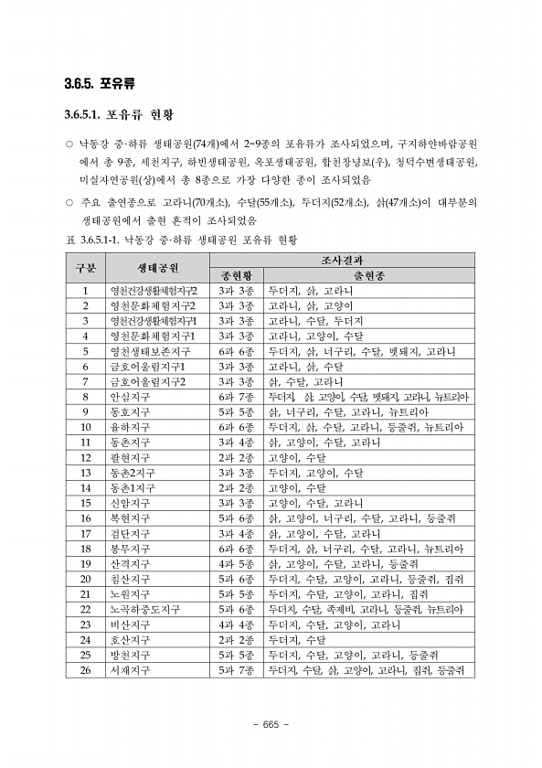 객도 확인되지 않았다. 외래양서·파충류는 관찰되지 않았다. 12-2 오천솔밭유 원지 인근 오십천 의 하상 구조는 S 10%, G 70% 그리고 P 20% 등으로 구성되 어 있었다. 수생 식물은 관찰되지 않았으며, 인가는 조사지 주변에서 관찰되지 않았다. 수변 데크는 없었고, 이용객도 확인되지 않았다. 외래양서·파충류는 관찰되지 않았다. 12-3 덕곡교는 하상 M 30%, S 50% 그리고 G 20%의 하천이 다. 수생 식물은 관찰되지 않았으며, 인가는 20채 미만이었다. 수변 데크는 설 치되어 있지 않았고, 이용객은 관찰되지 않았다. 외래양서·파충류는 관찰되지 않았다. 12-4 창수저수지는 다목적으로 사용되는 저수지이다. 수생식물은 저수 지의 약 10% 면적으로 형성되어 있었으며, 인가는 5채 미만이었다. ...