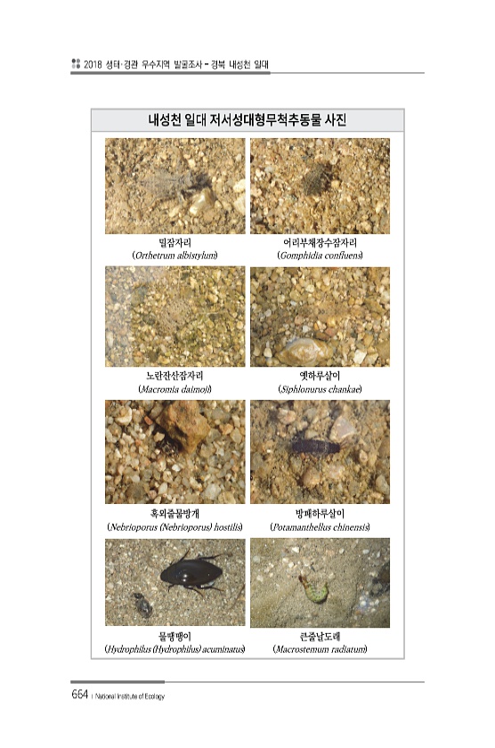 2018 생태·경관 우수지역 발굴조사 경북 내성천 일대 664 ? National Institute of Ecology 밀잠자리 Orthetrum albistylum 어리부채장수잠자리 Gomphidia confluens 노란잔산잠자리 Macromia daimoji 옛하루살이 Siphlonurus chankae 혹외줄물방개 Nebrioporus Nebrioporus hostilis 방패하루살이 Potamanthellus chinensis 물땡땡이 Hydrophilus Hydrophilus acuminatus 큰줄날도래 Macrostemum radiatum