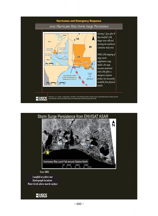 Envisat ASAR 29 July 2005 Hurricane Rita Land Fall around Sabine North CS27 CS20 ME11 ME04 Storm Surge Persistence from ENVISAT ASAR Year 2005 Landfall at yellow star Hydrograph locations Water levels above marsh surface 2005 Hurricane Rita Storm Surge Persistence Hurricanes and Emergency Response Starting 7 days after H Rita landfall, SAR images were collected covering the southwest Louisiana stu...