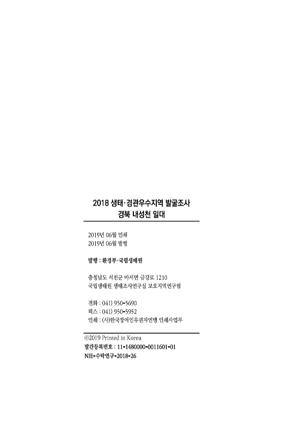2018 생태·경관우수지역 발굴조사 경북 내성천 일대 2019년 06월 인쇄 2019년 06월 발행 발행 환경부·국립생태원 충청남도 서천군 마서면 금강로 1210 국립생태원 생태조사연구실 보호지역연구팀 전화 041 950-5690 팩스 041 950-5952 인쇄 사 한국장애인유권자연맹 인쇄사업부 ⓒ2019 Printed in Korea 발간등록번호 11-1480000-0011601-01NIE-수탁연구-2018-26