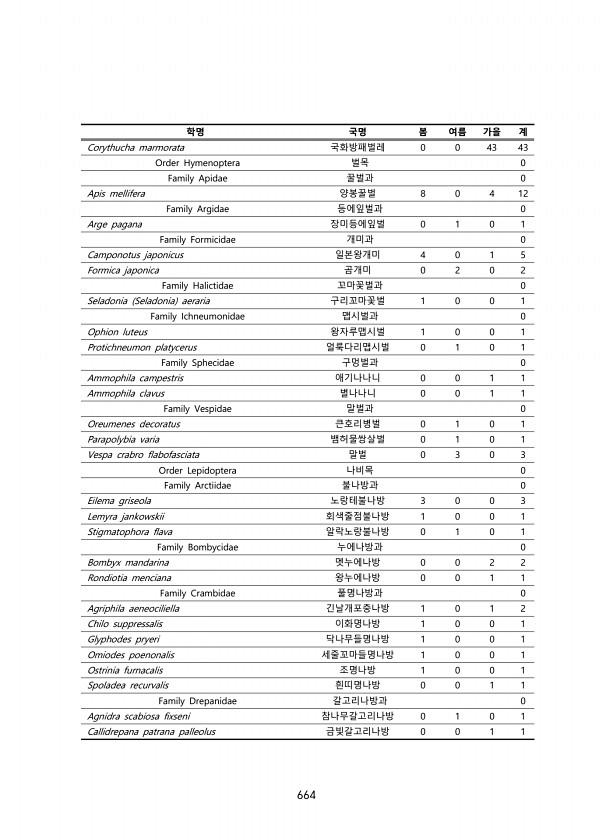 664 학명 국명 봄 여름 가을 계 Corythucha marmorata 국화방패벌레 0 0 43 43 Order Hymenoptera 벌목 0 Family Apidae 꿀벌과 0 Apis mellifera 양봉꿀벌 8 0 4 12 Family Argidae 등에잎벌과 0 Arge pagana 장미등에잎벌 0 1 0 1 Family Formicidae 개미과 0 Camponotus japonicus 일본왕개미 4 0 1 5 Formica japonica 곰개미 0 2 0 2 Family Halictidae 꼬마꽃벌과 0 Seladonia Seladonia aeraria 구리꼬마꽃벌 1 0 0 1 Family Ichneumonidae 맵시벌과 0 Ophion luteus 왕자루맵시벌 1 0 0 1 Protic...