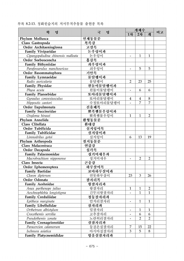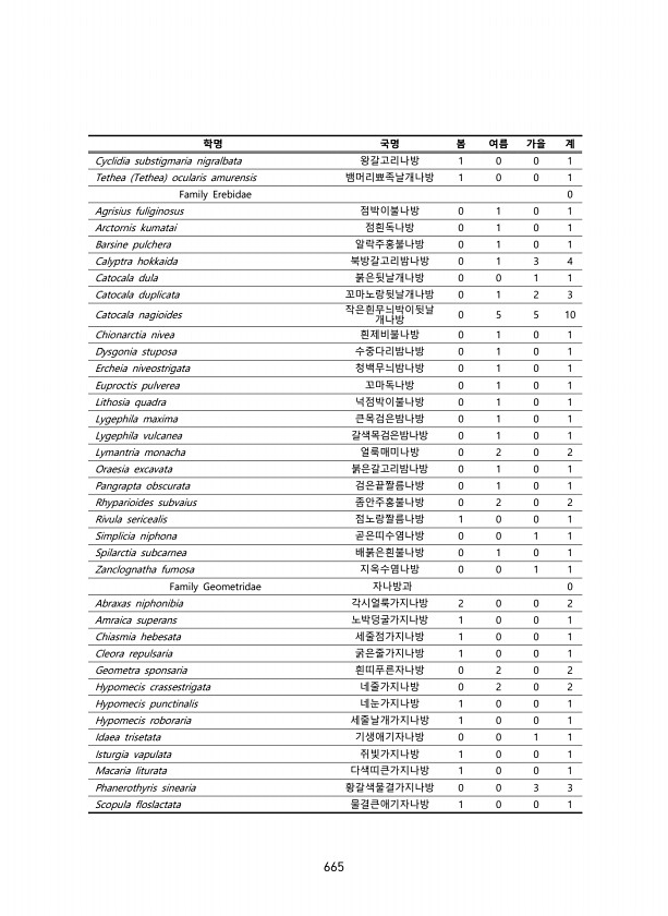 665 학명 국명 봄 여름 가을 계 Cyclidia substigmaria nigralbata 왕갈고리나방 1 0 0 1 Tethea Tethea ocularis amurensis 뱀머리뾰족날개나방 1 0 0 1 Family Erebidae 0 Agrisius fuliginosus 점박이불나방 0 1 0 1 Arctornis kumatai 점흰독나방 0 1 0 1 Barsine pulchera 알락주홍불나방 0 1 0 1 Calyptra hokkaida 북방갈고리밤나방 0 1 3 4 Catocala dula 붉은뒷날개나방 0 0 1 1 Catocala duplicata 꼬마노랑뒷날개나방 0 1 2 3 Catocala nagioides 작은흰무늬박이뒷날 개나방 0 5 5 10 Chionarctia nivea ...