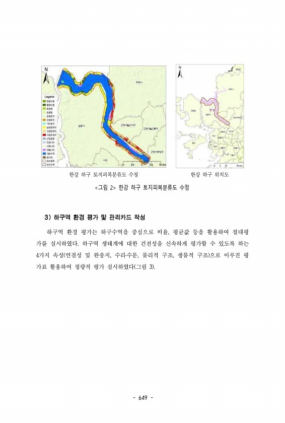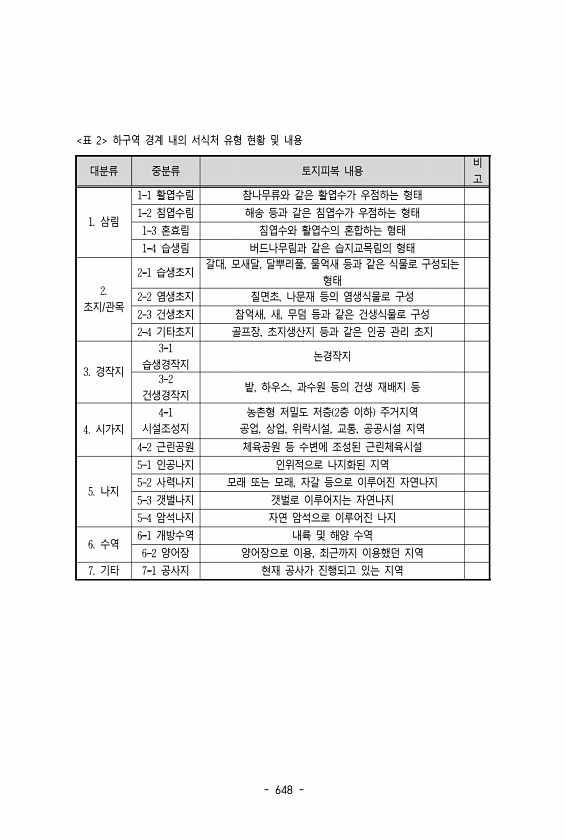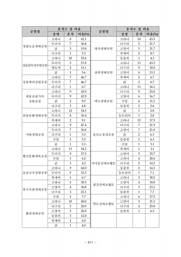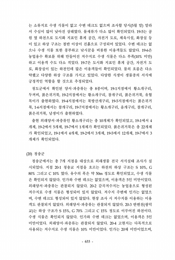 는 소류지로 수생 식물이 없고 수변 데크도 없으며 조사할 당시 5월 말 말라 서 수심이 많이 낮아진 상태였다. 물새류가 다소 많이 확인되었다. 19-5는 공 원 옆 하천으로 도시화 지표인 휴게 공간, 자전거 도로, 체육시설, 화장실 등 이 있고 하상 구조는 절반 이상이 진흙으로 구성되어 있었다. 수변 데크는 없 으나 수생 식물 또한 풍부하고 낚시꾼을 비롯한 이용객들도 많았다. 19-6은 농업용수 확보를 위해 만들어진 저수지로 수생 식물은 다소 부족 10% 미만 하고 이용객 수도 다소 적었다. 19-7은 도시화 지표인 휴게 공간, 자전거 도 로, 화장실이 있는 하천인데 많은 이용객들이 확인되었다. 물의 흐름은 다소 약했고 다양한 하상 구조를 가지고 있었다. 다양한 식생이 생물종의 서식에 긍정적인 역할을 할 것...