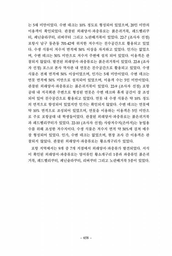 는 5채 미만이었다. 수변 데크는 10% 정도로 형성되어 있었으며, 20인 미만의 이용객이 확인되었다. 관찰된 외래양서·파충류로는 붉은귀거북, 레드벨리쿠 터, 페닌슐라쿠터, 리버쿠터 그리고 노란배거북이 있었다. 22-7 조사자 선정 포항시 남구 동촌동 701-42에 위치한 저수지는 친수공간으로 활용되고 있었 다. 수생 식물이 저수지 면적에 50% 이상을 차지하고 있었다. 인가는 없었으 며, 수변 데크는 50% 미만으로 저수지 주변에 설치 되어 있었다. 이용객은 관 찰되지 않았다. 발견된 외래양서·파충류로는 붉은귀거북이 있었다. 22-8 조사 자 선정 포스코 본사 역사관 내 연못은 친수공간으로 활용되고 있었다. 수생 식물은 전체 면적에 50% 이상이었으며, 인가는 5채 미만이었다. 수변 데크는 연못 면적에 5...