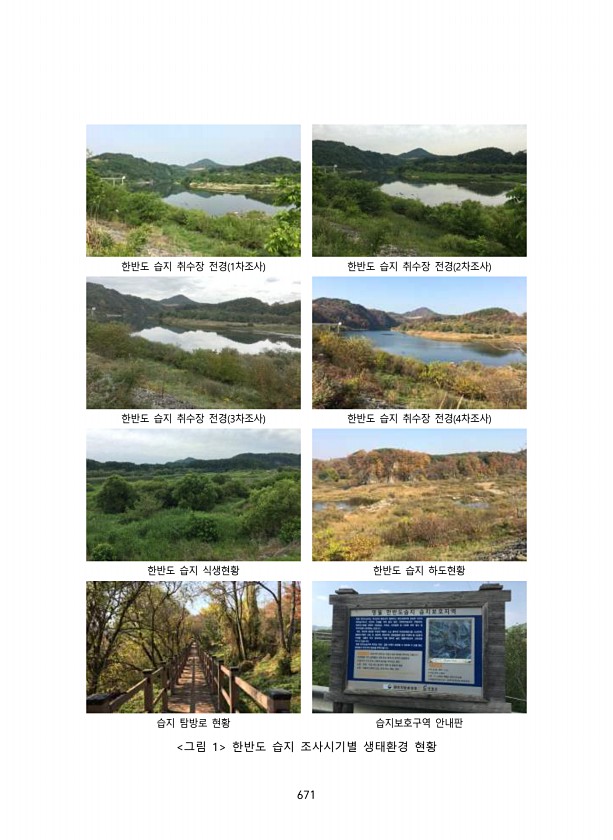 671 한반도 습지 취수장 전경 1차조사 한반도 습지 취수장 전경 2차조사 한반도 습지 취수장 전경 3차조사 한반도 습지 취수장 전경 4차조사 한반도 습지 식생현황 한반도 습지 하도현황 습지 탐방로 현황 습지보호구역 안내판 그림 1 한반도 습지 조사시기별 생태환경현황