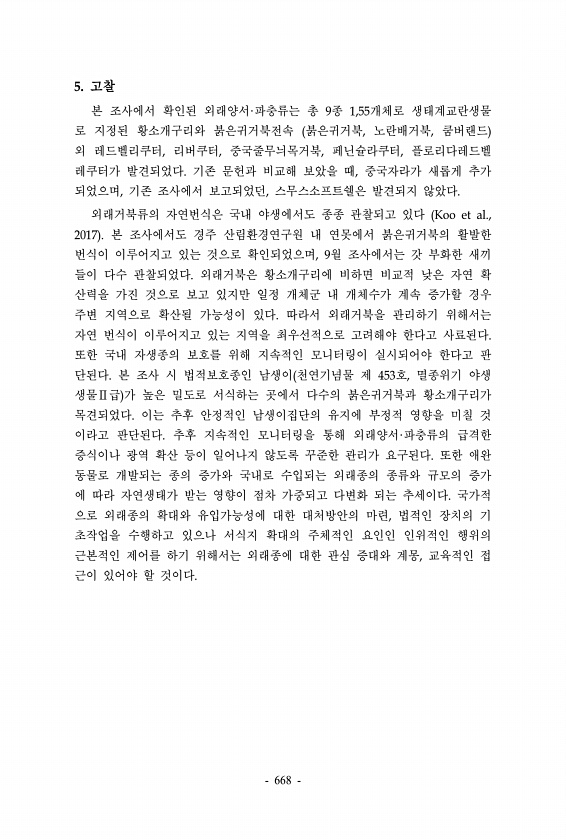 5. 고찰 본 조사에서 확인된 외래양서·파충류는 총 9종 1,55개체로 생태계교란생물 로 지정된 황소개구리와 붉은귀거북전속 붉은귀거북, 노란배거북, 쿰버랜드 외 레드벨리쿠터, 리버쿠터, 중국줄무늬목거북, 페닌슐라쿠터, 플로리다레드벨 레쿠터가 발견되었다. 기존 문헌과 비교해 보았을 때, 중국자라가 새롭게 추가 되었으며, 기존 조사에서 보고되었던, 스무스소프트쉘은 발견되지 않았다. 외래거북류의 자연번식은 국내 야생에서도 종종 관찰되고 있다 Koo et al., 2017 본 조사에서도 경주 산림환경연구원 내 연못에서 붉은귀거북의 활발한 번식이 이루어지고 있는 것으로 확인되었으며, 9월 조사에서는 갓 부화한 새끼 들이 다수 관찰되었다. 외래거북은 황소개구리에 비하면 비교적 낮은 자연 확 산력을 가진 것으로 보고 있...