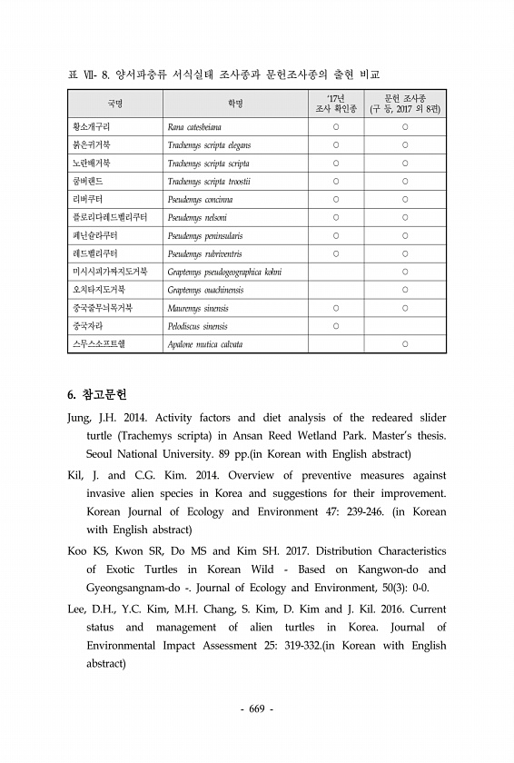표 Ⅶ- 8. 양서파충류 서식실태 조사종과 문헌조사종의 출현 비교 국명 학명 ‘17년 조사 확인종 문헌 조사종 구 등, 2017 외 8편 황소개구리 Rana catesbeiana ○ ○ 붉은귀거북 Trachemys scripta elegans ○ ○ 노란배거북 Trachemys scripta scripta ○ ○ 쿰버랜드 Trachemys scripta troostii ○ ○ 리버쿠터 Pseudemys concinna ○ ○ 플로리다레드벨리쿠터 Pseudemys nelsoni ○ ○ 페닌슐라쿠터 Pseudemys peninsularis ○ ○ 레드벨리쿠터 Pseudemys rubriventris ○ ○ 미시시피가짜지도거북 Graptemys pseudogeographica kohni ○ 오치타지도거북 Grap...